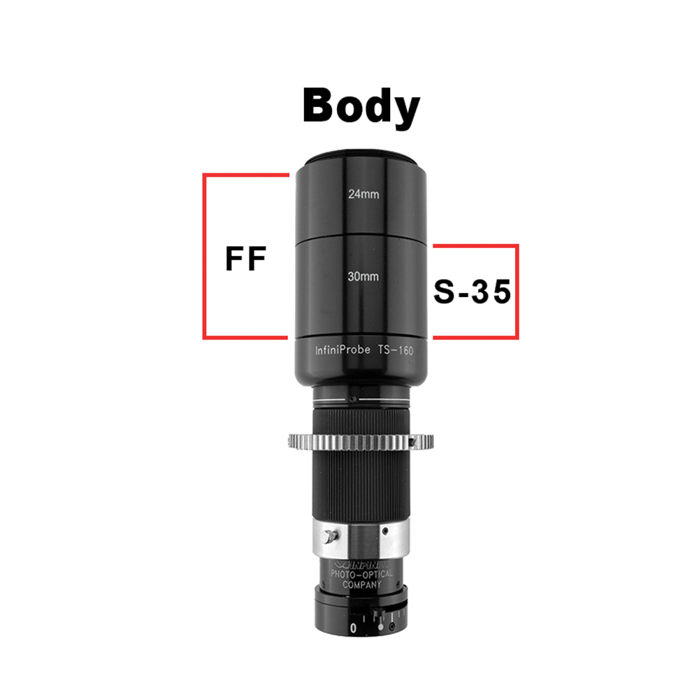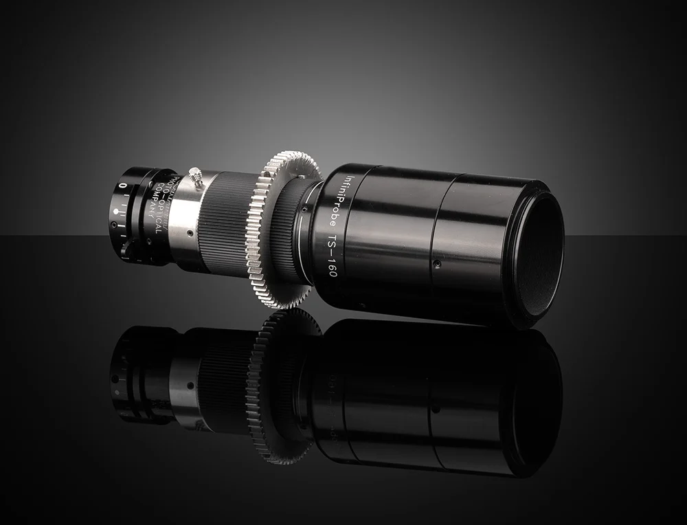 TS-160 Main Body with Cine-Style Focus Gear and Iris Control, supports five lenses; Macro Pro lens (0-4x), a Micro HM lens (0-16x), and three SFX deep focus lenses keeping focus from infinity to two inches.